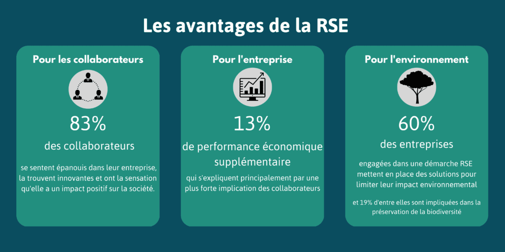 Selon une autre étude menée par l’Institut France Stratégie, s’engager dans une démarche RSE incite les entreprises à agir davantage pour l’environnement. D’ailleurs, 61% des entreprises avec des pratiques RSE, ont mis en place une ou des méthodes de gestion pour estimer leur impact sur l’environnement. De même, 60% des entreprises engagées dans une démarche RSE mettent en place des solutions pour améliorer l’efficacité énergétique et réduire les émissions de gaz à effet de serre. A l’inverse, seulement 27% des sociétés sans démarche RSE le font. Il est pertinent d’ajouter que 19% des entreprises engagées dans une démarche RSE s’impliquent dans la préservation de la biodiversité contre 5% chez les entreprises sans RSE.